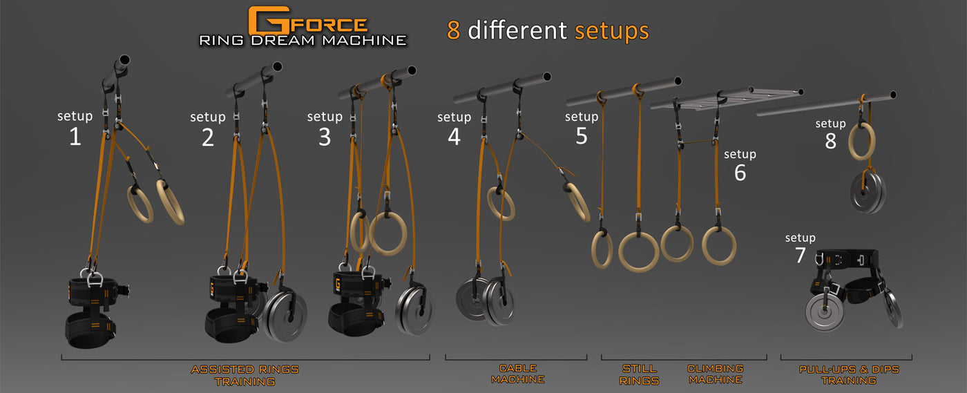 The RING DREAM MACHINE offers 8 exclusive training setups, each providing different levels of support—from beginner to advanced—allowing you to approach and train a wide range of bodyweight skills with confidence and perfect technique.